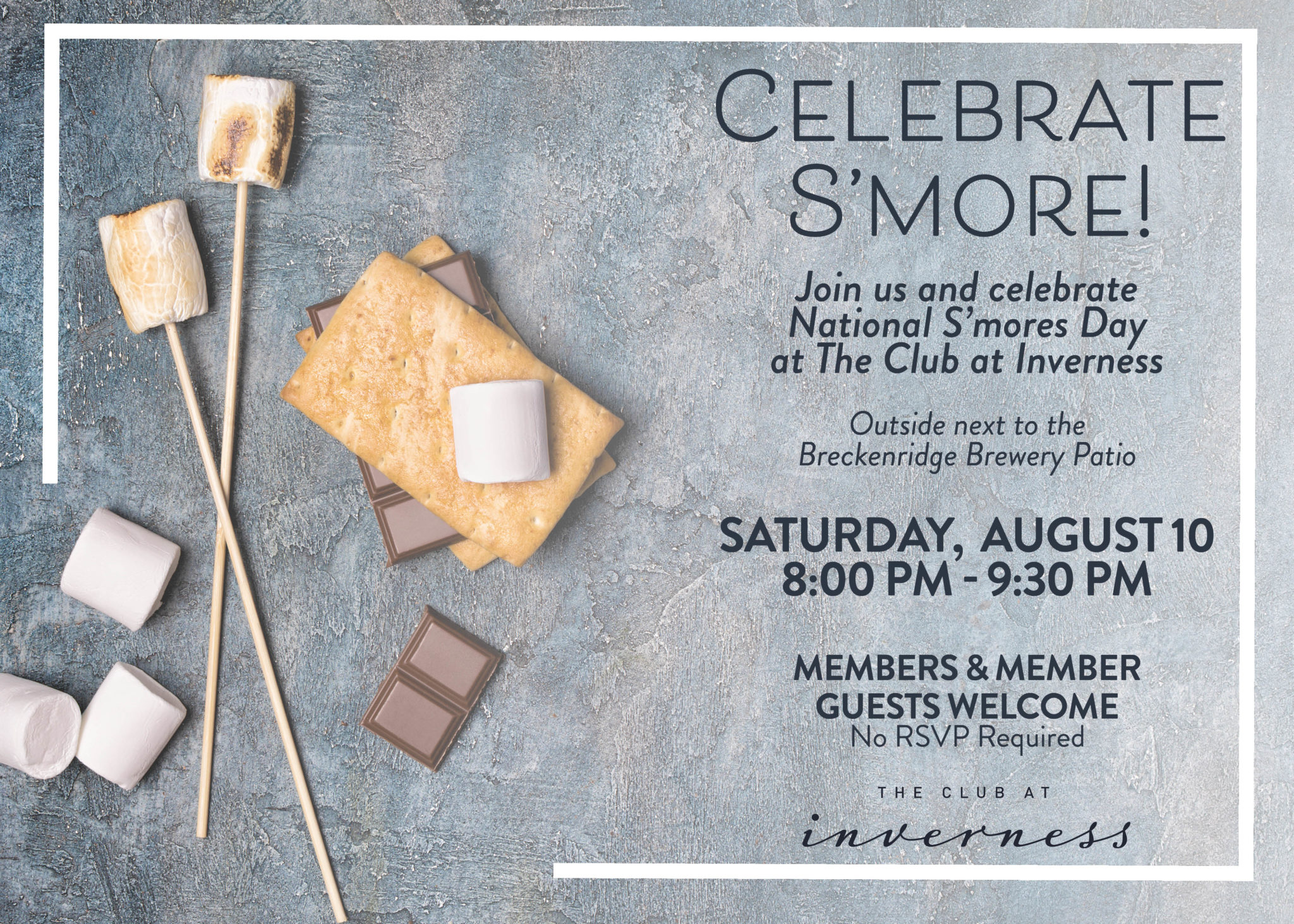 « All Events This event has passed. Celebrate S’more! August 10, 2019 @ 8:00 pm - 9:30 pm Join us to celebrate National S’mores Day here at The Club at Inverness. Add to calendar Google Calendar iCalendar Outlook 365 Outlook Live Details Date: August 10, 2019 Time: 8:00 pm - 9:30 pm Event Category: Social Venue The Club at Inverness 200 Inverness Drive West Suite 100 Englewood, CO 80112 United States + Google Map