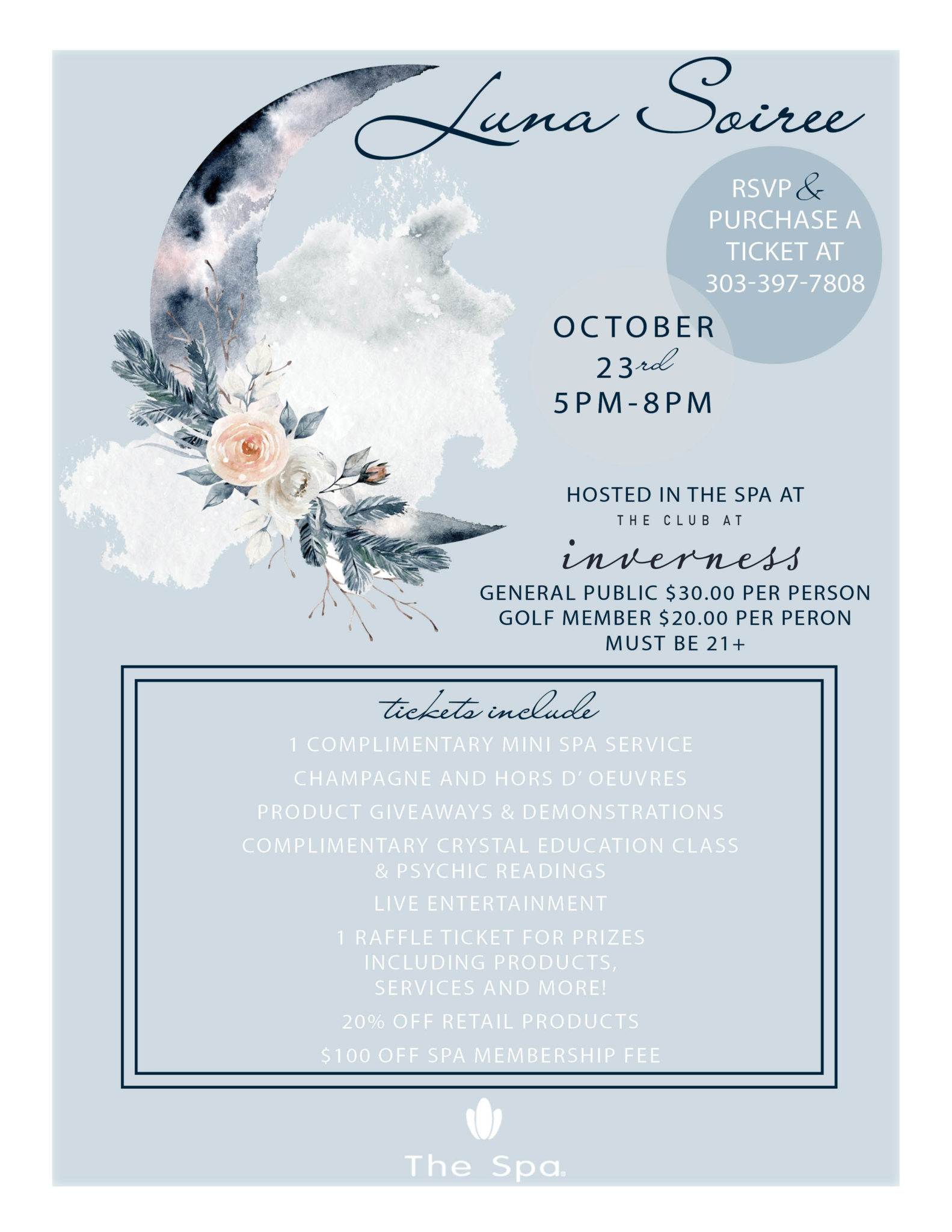 « All Events This event has passed. Luna Soiree October 23, 2019 @ 5:00 pm - 8:00 pm Add to calendar Google Calendar iCalendar Outlook 365 Outlook Live Details Date: October 23, 2019 Time: 5:00 pm - 8:00 pm Event Categories: Social, Spa Venue The Spa 200 Inverness Drive West Englewood, CO 80112 United States + Google Map Phone 303-397-7808